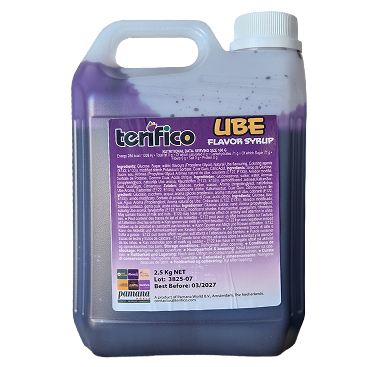 Ingredients: Sirop de Glucose, Sucre, eau, Arômes (Propylène Glycol, Arômes naturel de Ube, colorants (E122, E133)), Amidon modifié, Sorbate de Potasse, Gomme Guar, Acide citrique.