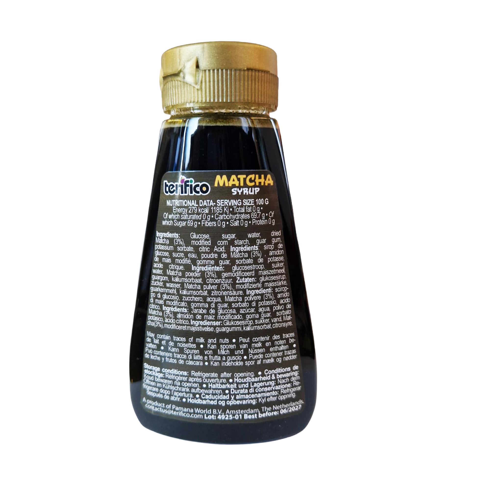Ingredientes: Jarabe de glucosa, azúcar, agua, hojas secas de matcha, almidón de maíz modificado, goma guar, conservador (sorbato de potasio), ácido cítrico.